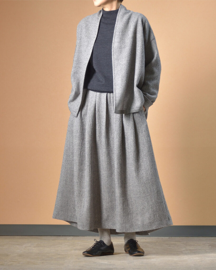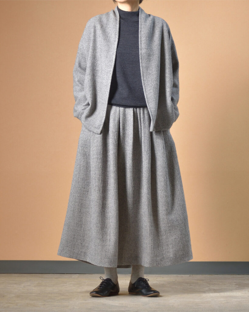 ニットなのか織物なのか、不思議な質感の素材で作られたカーディガンとスカートなんです。とにかく軽くて暖かい。この時期に嬉しいポイントですよね。